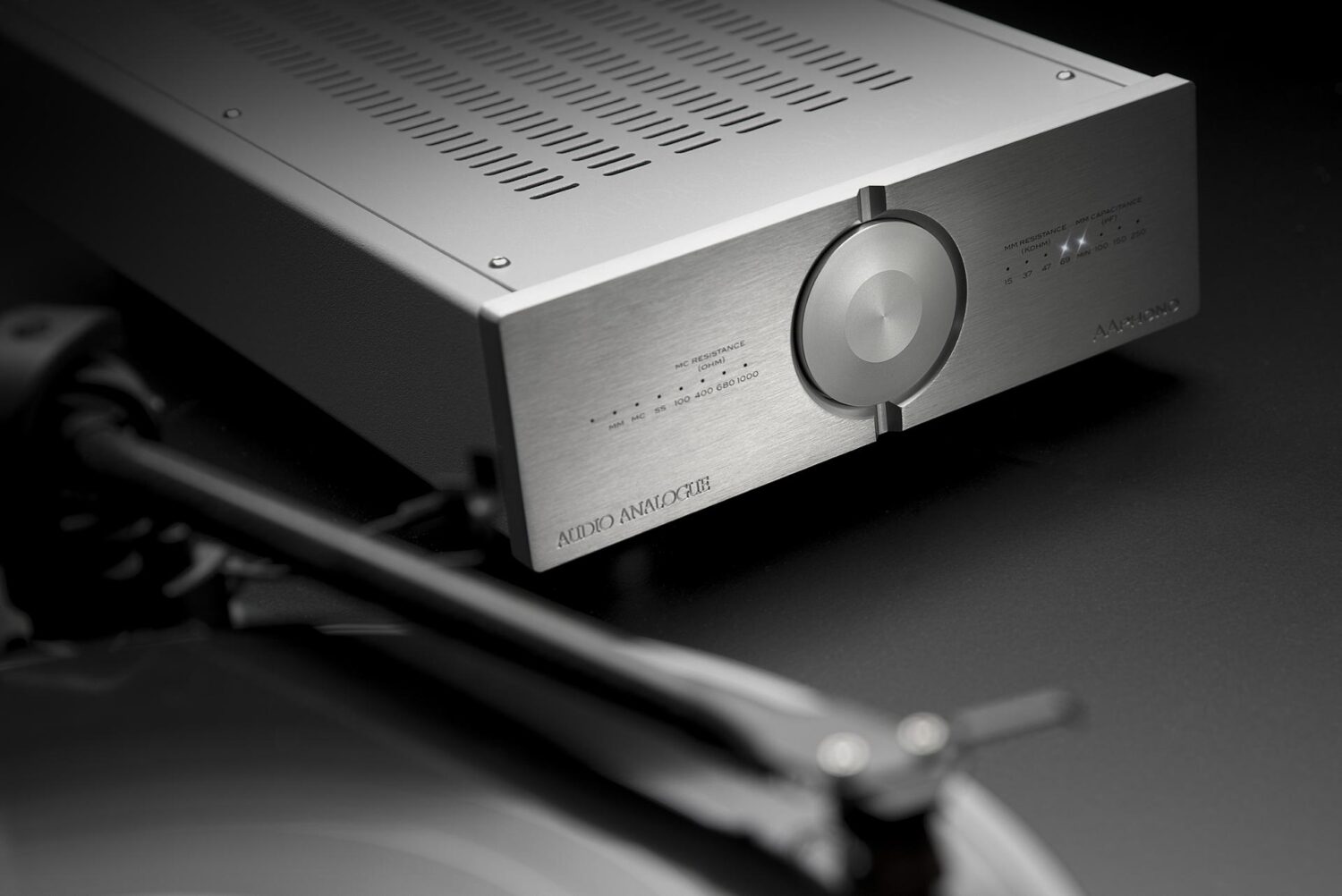 AAphono has been developed starting by a double operational amplifier configuration that permits to share the total gain between the two amplifiers having in this way a more precise RIAA response. A big effort was made to obtain a good result in this parameter using high quality and low tolerance components used in parallel configuration in order to uniform errors. In order to cancel eventual LP’s fluctuations a subsonic filter has been added between first and second amplifiers to avoid that strong low frequency oscillations would saturate the gain stages. The circuit design has been completed with an offset recover in the last stage and multiple filters in the power supply stage. There are three different toroidal transfomers to supply digital section and left and right analog sections, keeping ground connections separated. All passive components have been carefully selected. Capacitors used for RIAA curve equalization are all plastic film with low tolerance. AAphono is very versatile and simple to use. For MM cartridges it is possible to set the input’s capacitance and resistance, while for MC cartridges, it is possible to set input’s resistance. These regulations can be easily done simply pushing the corresponding buttons under the unit, just behind the front panel, without removing anything or without using many different switches. The selected configuration will remain settled also when the unit will be switched off or disconnected by the power network.